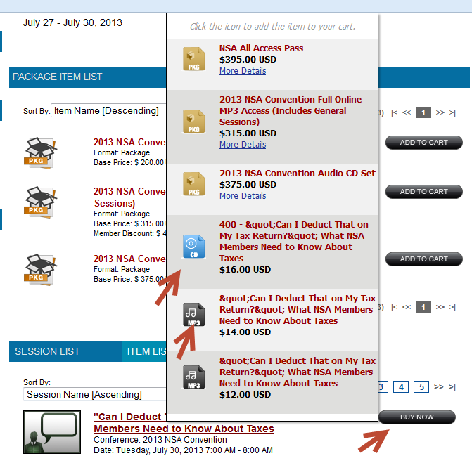 A simple way to shop for a desired product is by using the "Event List" section or by clicking on the shopping cart icon or "Add to Cart" button below the product you would like to purchase. Click on the event name and you will be taken to a list of all the available sessions for purchase. You can use the "sort by" drop down menu to narrow your search by conference name, session name, or date. Some conferences will let you purchase individual sessions and some may only have the full conference recordings available for purchasing.